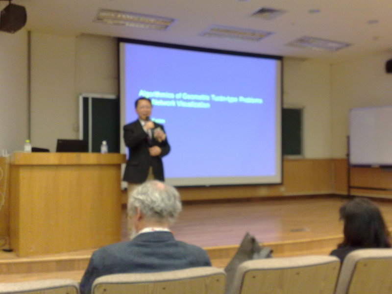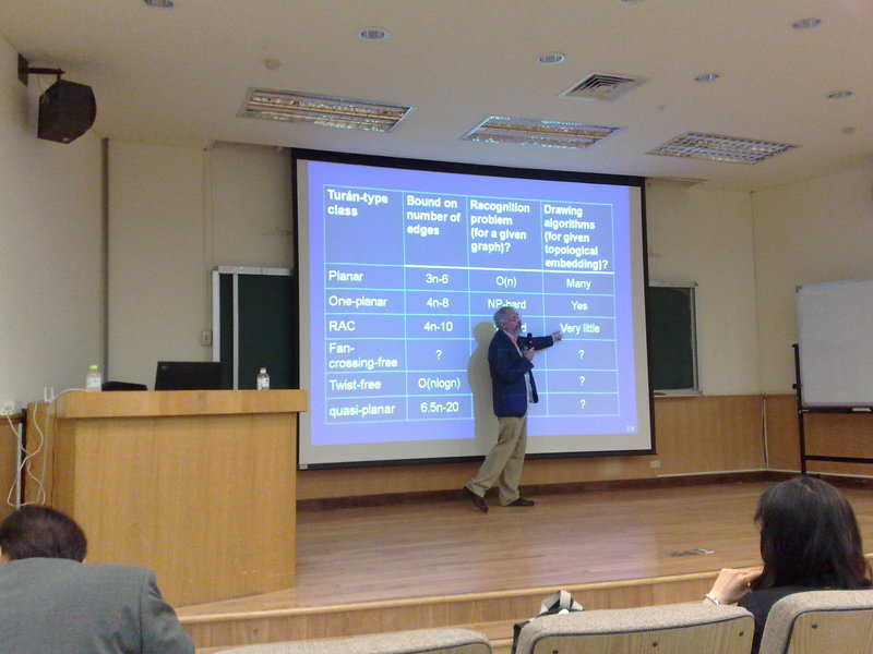 The keynote for the first day was given by Peter Eades from Australia. Peter’s talk is IMHO the best talk in the whole conference. He gave a broad overview of the area of graph drawing and went into some depth for a number of problems he worked on.