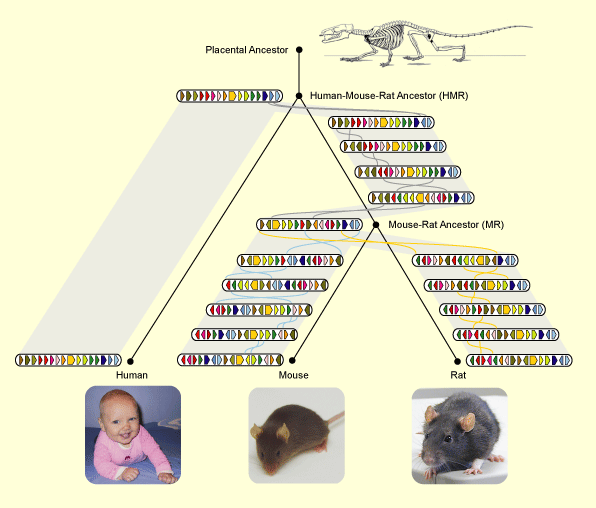My own work in the comparative genomics of gene order is from the second category. The data I am considering is a set of gene orders, where a gene order is the sequence of genes that makes up the genome of a species. Although many species share a large number of genes, the arrangement of these genes are different due to large scale rearrangement events (see Figure 1 above) that has the effect of shuffling the genes around.